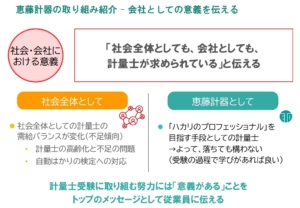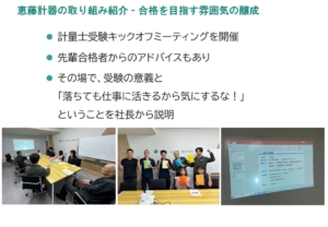 当社代表の瀬口からも、“恵藤計器における計量士育成の取り組み”をプレゼンさせていただき、いかにして難関資格である計量士に挑戦する従業員を増やしているか、ご紹介をさせていただきました。